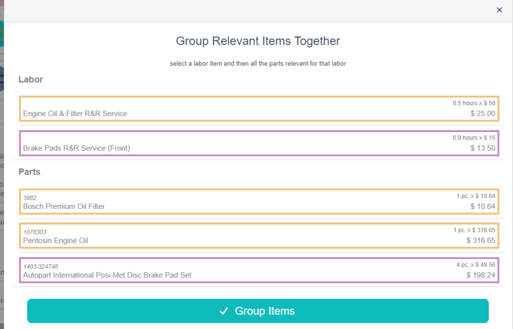 A new window will open that allows you to select the items. First, select one labor item by clicking on it. It will be marked by a colorful border. Now, continue to select the relevant Parts associated with that labor. Once you’re done with that first group, click the “Group Items” button