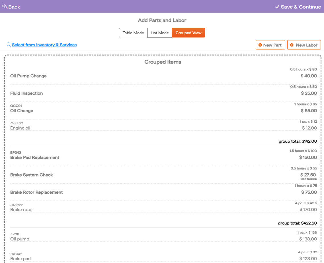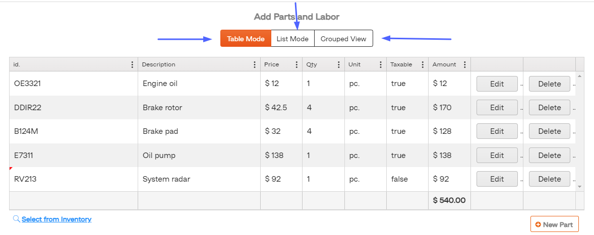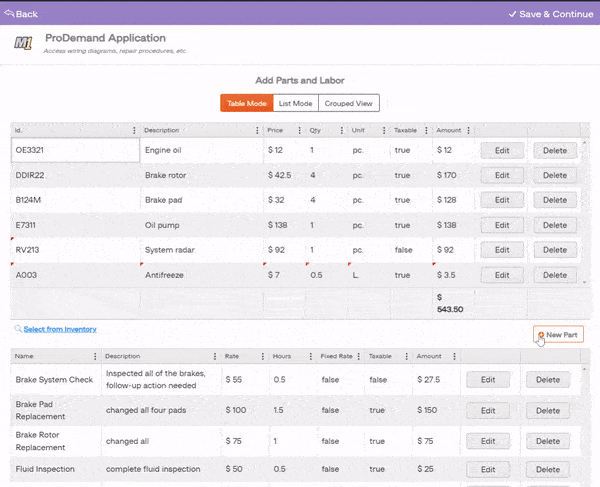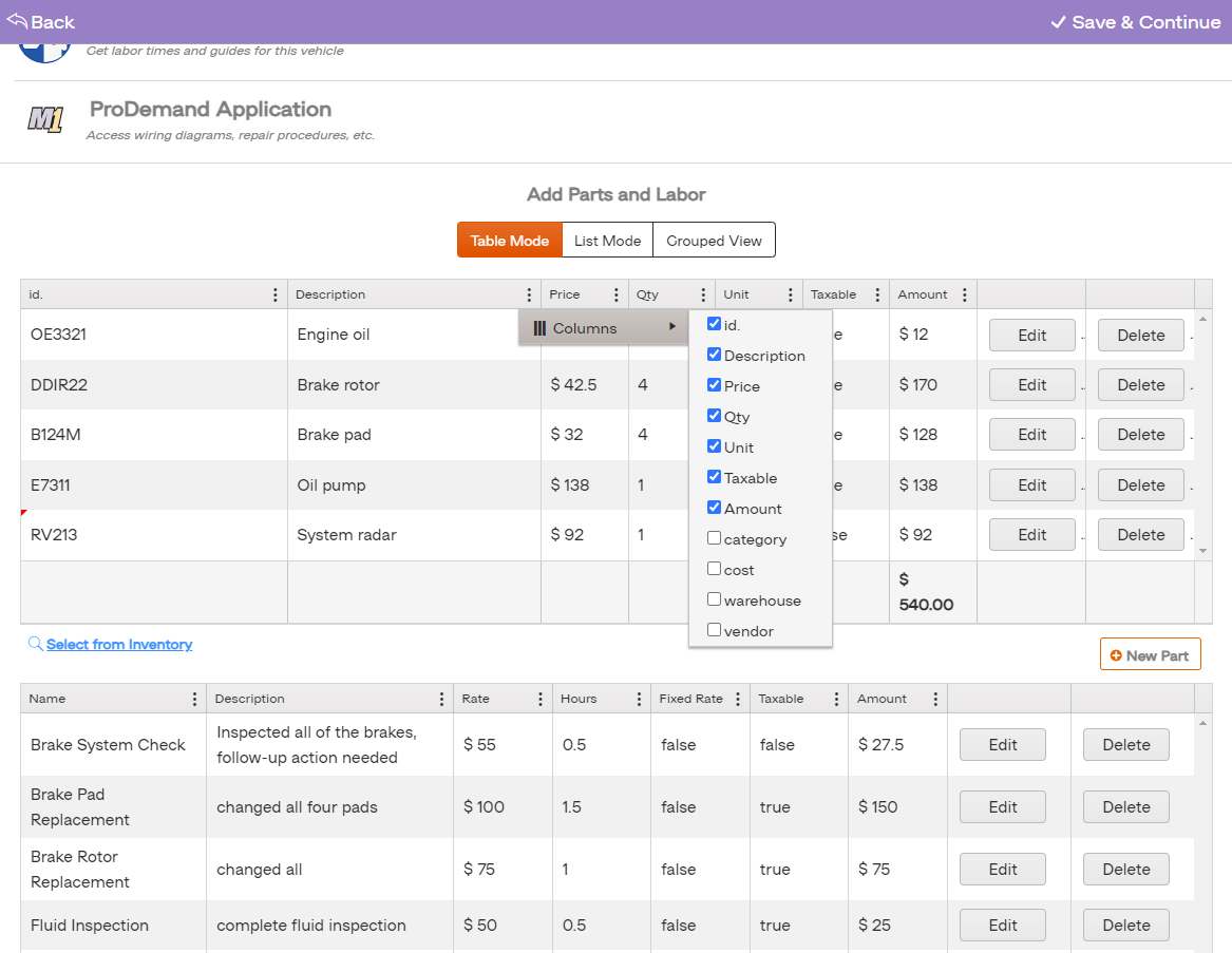 The table mode is your go-to option if you need to add parts and labor quickly. This can be extremely helpful in scenarios where you need to edit one or two items and you don’t have to add them from the inventory menu.