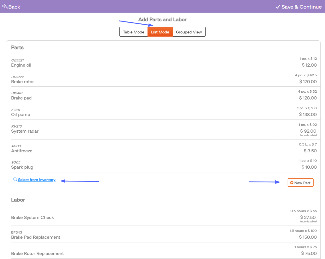 Table Mode is the new default mode that allows you to add parts and labor while remaining on the same page.