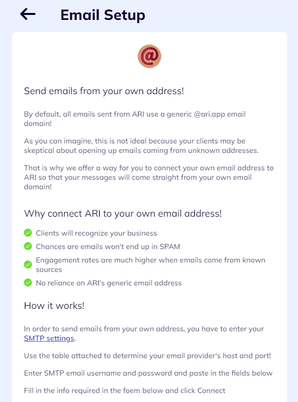 If you want to take advantage of these benefits, the easiest way is to set up your email address. Do that from ARI Settings -> Email Address Setup. Once there, read the instructions and input the required SMTP settings. We’ve linked a guide that will help you complete the steps.