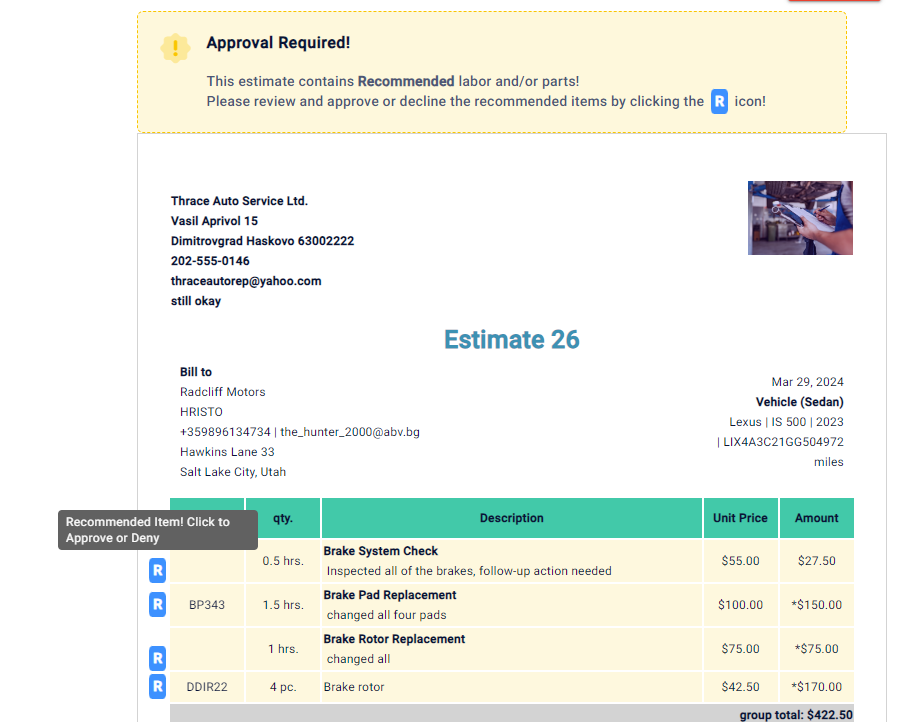 Upon clicking the “R” button next to the invoice item – they can either approve or deny the recommended item. After they do this – you will see this updated on the invoice/ job card itself.