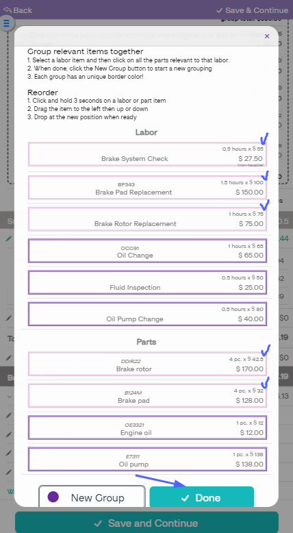 To create a group – open an Invoice and start adding parts and labor. Once you are done, click “Reorder& Group Items”, select the labor item(or items) and click on the parts related to that labor. When ready – click the “New Group” button. That automatically groups the next items you select with a new border color to differentiate between them. If you want to change a labor item or a part from a group – double-click on them to remove the color, create a new group, or leave the items ungrouped if that’s your intention.
