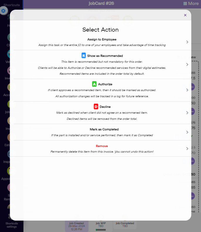 You also authorize or decline the items on an invoice, mark them as completed, or remove them with the help of this menu.