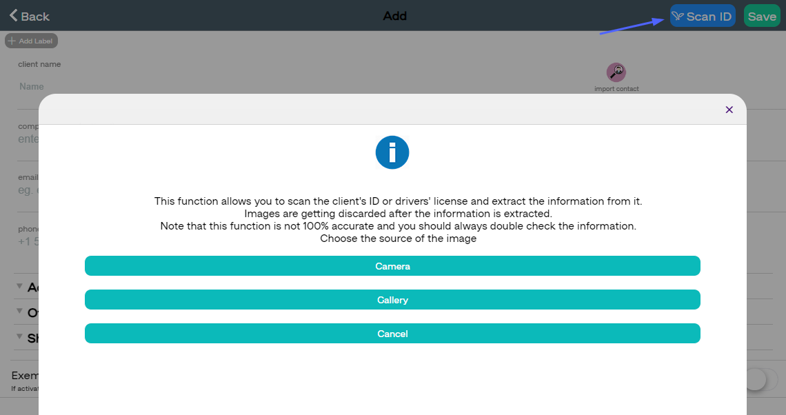 When creating a new client in ARI – you can get data straight from their ID, driver’s license, or other personal document. To do this – go to the client’s section and select the + button to add a new client. Then choose ‘Scan ID‘ and upload/ take a picture of the document and add it. The AI will check the document and pull any relevant data.