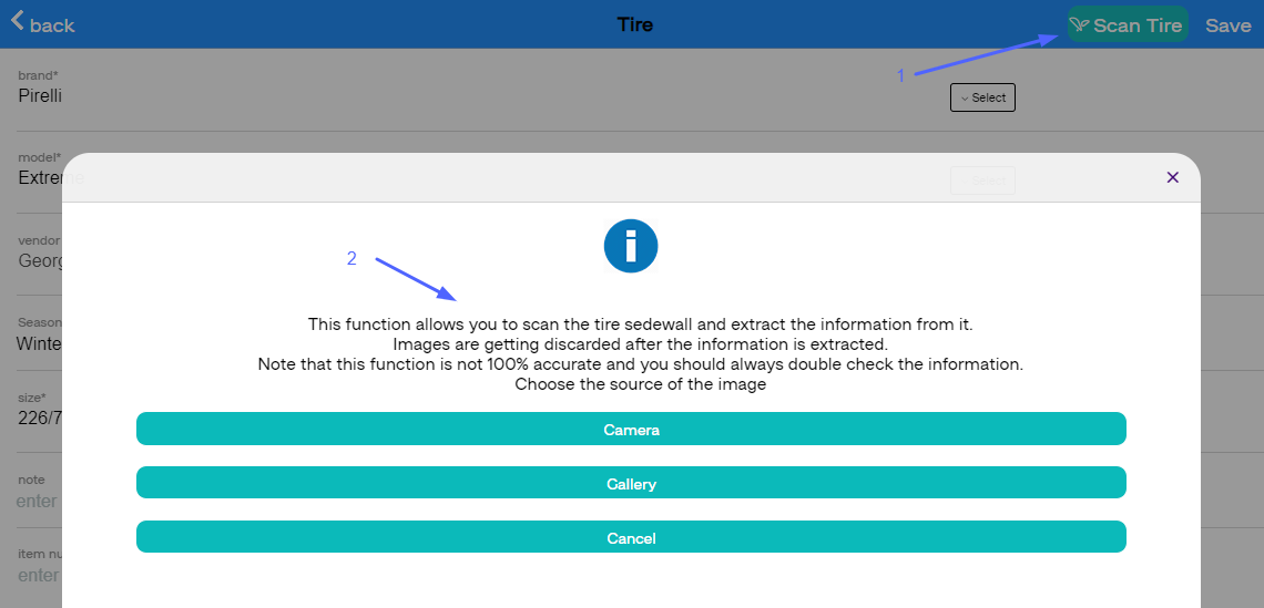 To use this feature – go to Inventory -> Tires -> Add a Tire. Then hit Scan Tire, grab your camera, and take a picture or upload a saved photo of the tire. The AI will scan it and you can choose if you want to transfer the data to your Tire inventory or cancel the process.