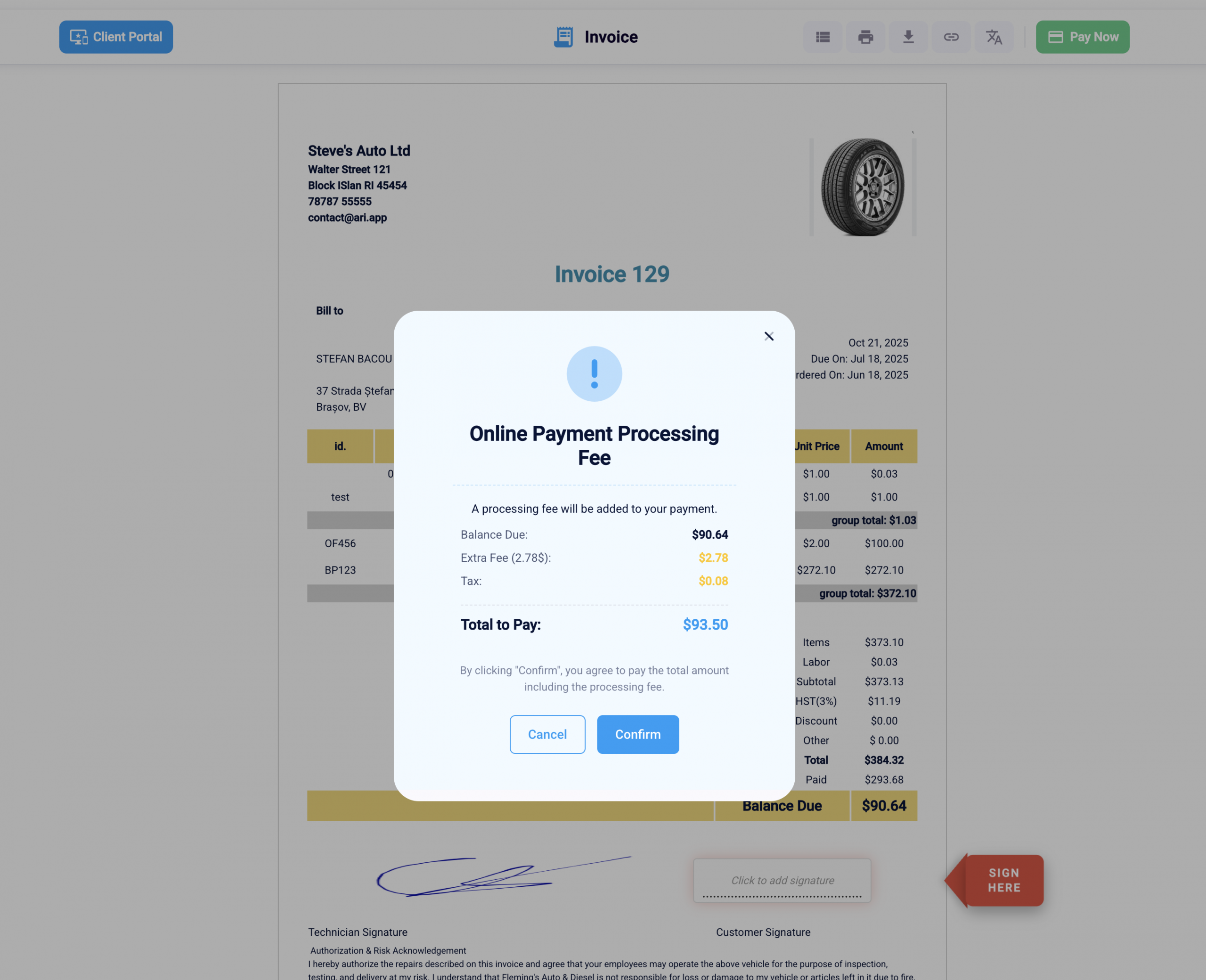 When the “Pass Fee to Client” option is turned on, ARI (Auto Repair Software) adds a clear disclosure step during online invoice payment. Customers see this disclosure before completing the payment, so they understand that a processing fee will be applied. This approach follows common best practices for payment transparency—showing relevant details at the right moment without overwhelming the user.